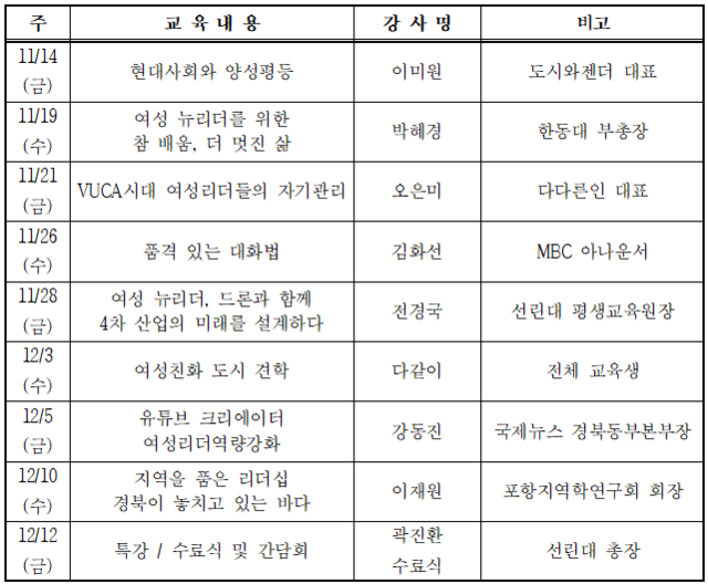 | 강좌소개 | 제27기 포항시 여성뉴리더 양성과정 교육생 모집 ○ 강의내용